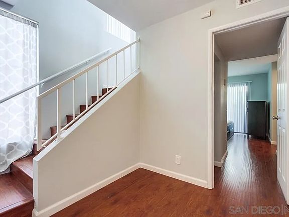 Discover this beautifully upgraded 2-bedroom, 2-bath townhome nestled in a quiet, desirable neighborhood and walking distance to SDSU. THREE PARKING SPACES: 1-car garage and 2 driveway spots. Step inside to rich wood flooring and fresh, modern paint throughout. The spacious master suite features a walk-in closet, while the open-concept family room offers a cozy fireplace and a private balcony—perfect for relaxing or entertaining. Enjoy a bright kitchen with classic white cabinetry, and the convenience of an in-unit laundry room. Newer washer, dryer, and refrigerator are all included in the sale! Additional highlights include a private one-car garage and a quaint backyard with a charming white fence. Located minutes from schools, freeways, and local amenities. HOA covers water and trash for easy living.
