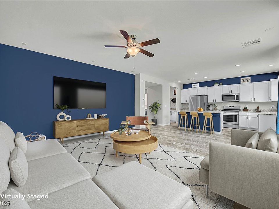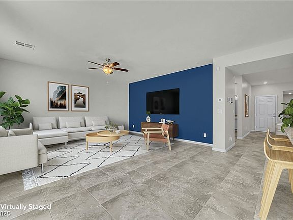 Assumable VA loan at just 2.5%! This stunning property offers 5 spacious bedrooms and 3 full bathrooms, including a convenient downstairs bedroom and bath—ideal for a home office, craft room, guests, or multigenerational living. Tall ceilings and an open-concept layout create a bright, airy feel throughout. The gorgeous kitchen features ample counter space, a large island, stainless steel appliances, and a perfect view of the inviting family room—great for everyday living and entertaining. Upstairs, enjoy a generous loft that works perfectly as a second living area, plus well-sized secondary bedrooms and a relaxing primary suite. Beautiful low-maintenance backyard with a large patio and synthetic grass—effortless outdoor living year-round. Located in the desirable Valley Vista master-planned community, you’ll love being just minutes from shopping, dining, entertainment, golf, parks, and convenient freeway access. Buyer must have available VA entitlement to qualify for the assumption.