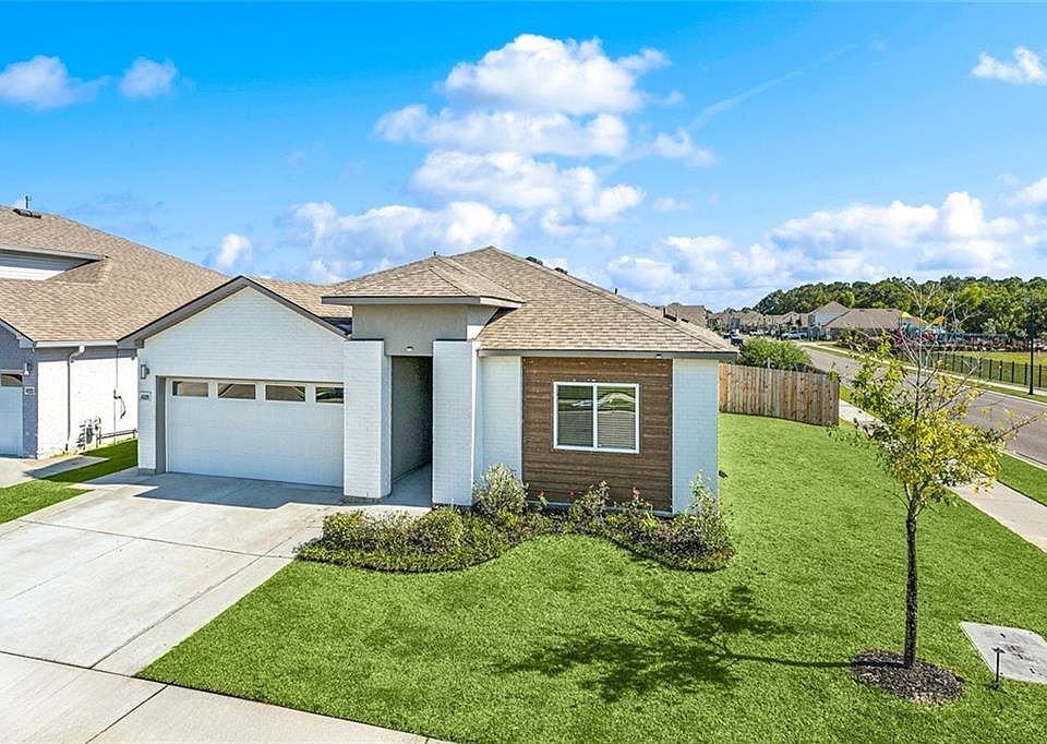 Welcome to this beautiful 4-bed, 2-bath home in the desirable Bellacosa subdivision! Built in 2021, this property stands out with its rare front façade featuring wood accents and corner lot location offering added privacy. Inside, enjoy a bright open floor plan with the kitchen, breakfast area, and family room flowing together well-suited for entertaining. The kitchen includes granite countertops, stainless steel appliances, vented hood, and a separate coffee bar with added storage. Refrigerator, washer, and dryer remain. The spacious primary suite features dual vanities, a garden tub, separate shower, and walk-in closet. Additional highlights include 9-ft ceilings, tankless water heater, EV outlet, generator hookup, wood blinds, and low-maintenance exterior. Wrought iron fenced yard with established trees providing privacy, covered patio, and raised garden beds. Located in Flood Zone X and easily accessible to community pool, playground, shopping, dining and all that Baton Rouge has to offer-this Bellacosa gem truly has it all!