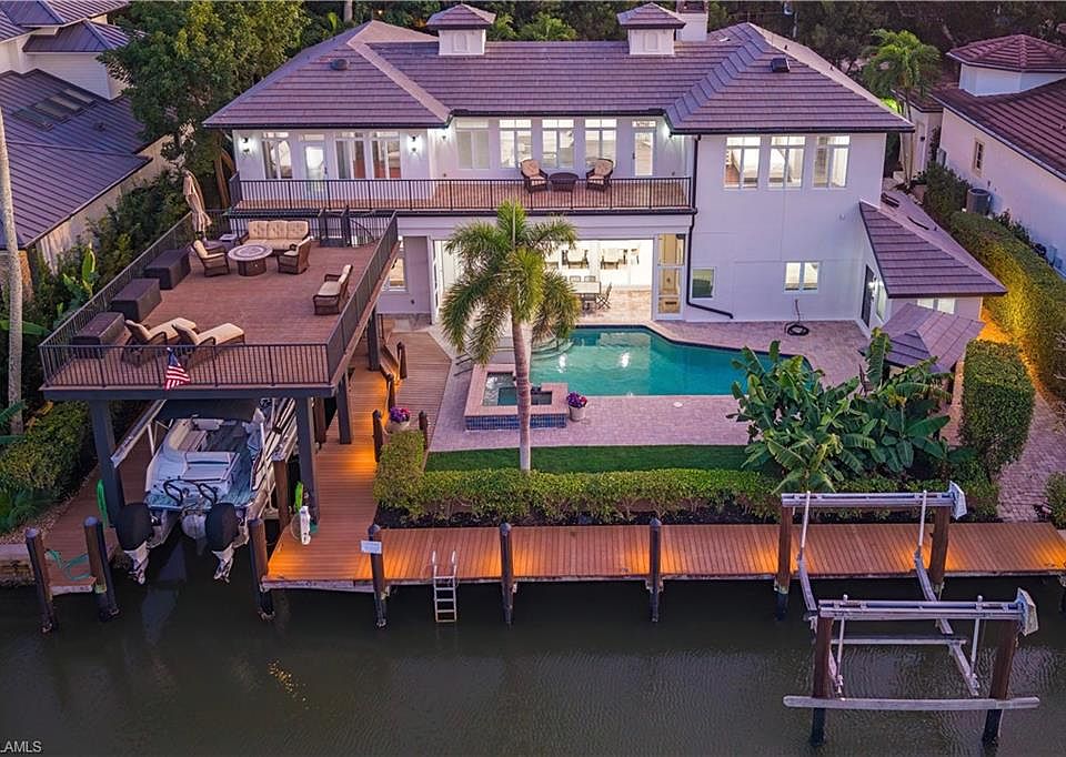 Olde Naples luxury living, elegantly defined! Posied on Aqualane Shores’ oak lined postcard- 18th Ave South, this expansive 6 bed, 5 ½ Bath, 5269 sf estate will leave you breathless! Meticulously refreshed in 2025 with a new modern tile roof, porcelain large-format tile floors, elegant wainscoting throughout, premium Thermador stainless-steel appliances, granite countertops, 2 new HVAC systems (Including duct work), new outdoor lighting, new Hurricane Impact doors and windows, new gas pool heater, in-home sauna, and MUCH more! This home features an upstairs primary suite fit for Naples Royalty! Complete with over 150sf of His/Her’s closet space, an additional 150sf secured storage room/office, large steam-ready walk-in shower, and balcony with water views, what more can you ask for? The main living level additionally features a 2nd primary suite with a private poolside entrance, large walk-in closet, and spacious sleeping quarters. With over 100 ft of dock frontage, a grandfathered in 30’x14’ boat house with sundeck above, two 12,000lb boat lifts, and a jet ski lift, this property is a Boaters paradise! Relax away the day poolside, enjoy sunset cocktails at the outdoor cabana, or soak up the sun on your 30’x20’ bay view sun deck, all in your backyard, outdoor oasis. Or after a long day, retreat to your own private massage room and in-home sauna. With only a 3 “Naples Block” straight walk to the Naples’ sugar sand beaches, Historic 3rd St shopping and dining, or a golf cart cruise to world-renown 5th Avenue, all that can be said is “Location, Location, Location”! Whether you are looking for a full-time Haven, or Seasonal Sanctuary, this Aqualane Oasis is the pinnacle Naples Living..... Capture the Naples Lifestyle!
