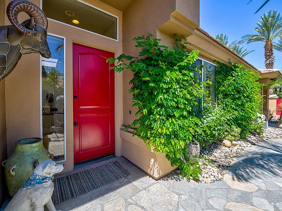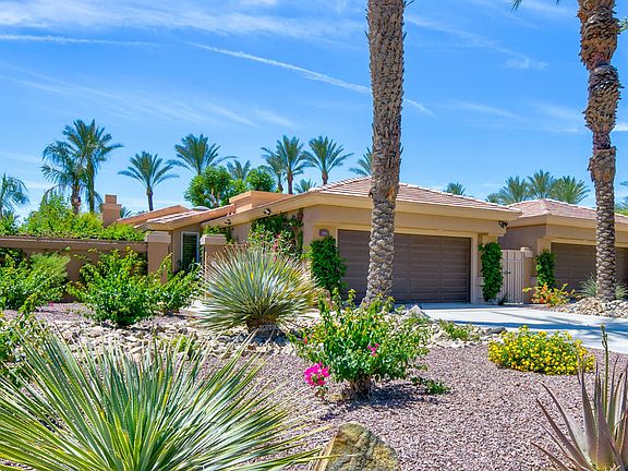 Welcome to this Desert Oasis! Be prepared to be wowed by Premier Indian Ridge Country Club offering a sense of community 'where there is something for everyone' Enjoy Golf, Sport Courts, Fitness, Spa & Pool Complex or discover the thrill of trying something new....dance, hike make new friends....there's an Active Social Calendar and Doggie Park too! Tall Palm Trees line this cul-de-sac location as desert landscaping extends to lush greenery in the private courtyard. A Contemporary, light-filled interior with high ceilings and sleek finishes immediately invites you to the Views beyond through wall-to-wall glass sliding doors. A well appointed kitchen opens to the living/dining area, perfect for entertaining friends and family. Indulge in the luxurious En Suite of the the Main Bedroom and enjoy privacy within it's courtyard. A guest bedroom and third bedroom, currently with a Murphy Bed to facilitate a BR/Den/Office, is joined by a spacious bathroom with dual vanities and private shower. Custom tile floors throughout the living area is enhanced with a granite 'motif'. Ceiling fans, sleek shutters, skylights, recessed and custom art lighting compliment the clean lines. This is Easy Living at it's Best and gives you more time to relax outdoors, on the tiled patio with sun & shade, a built-In BBQ, fountain & fire pit. Now it's time to enjoy your Desert Paradise and the beautiful lake, waterfall and forever fairway views.
