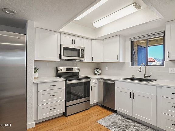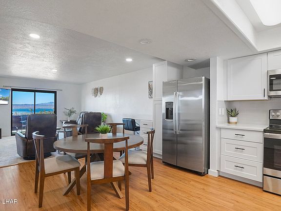 VIEWS, VIEWS, VIEWS!! Step into one of the most stunning LAKE VIEW condos on the market. This fully updated home features a brand-new kitchen, new stainless-steel appliances, new windows in the primary bedroom and sliding glass door, new flooring, and sleek modern closet doors. Enjoy sunrises from your front patio and unforgettable sunsets from the back. There is also a private laundry room on the front patio inside a locked utility closet. Ideally located with access to a heated pool and spa, this condo delivers the Havasu lifestyle everyone wants. Move fast—homes with these Lake Views don't last!