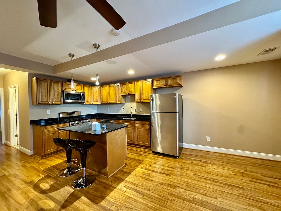 Open-concept kitchenGranite counter topsCentral hvacRecessed lightsHardwood floorsStainless steel appliancesCeiling fans