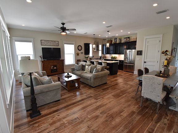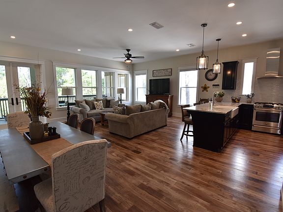 Spectacular custom built home located just a short walk, bike or golf cart ride to the beach! This is not a cookie cutter beach house! Meticulous attention to detail was given to every aspect of this home. Its 275 ft. deep lot overlooking the tranquility of Big Redfish Lake was the inspiration to create a rear open living space, taking advantage of the privacy and magnificent views. From this open area, a screened-in back porch leads out to a covered grilling deck, large backyard with stone fire pit…and plenty of room to add a pool! Inside are 10 ft. ceilings, hardwood floors, 8 ft. solid doors, Quartz countertops, upgraded stainless steel appliances, gas range, and generous walk-in pantry with custom shelving. One of the two master retreats is conveniently located on the first floor and the second master is upstairs, featuring its own expansive porch looking out onto the serene backyard setting. Also upstairs are two guest suites, each with its own private bath. Other special features of this home include a sizable garage, covered carport, paver driveway for additional parking, dual 16 SEER Carrier AC units with smart thermostats, Rinnai tankless gas water heater, and upgraded lighting and ceiling fans throughout. Lakeside Subdivision offers low HOA dues, a community pool and club house. Furnishings are negotiable.
