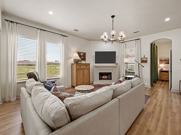 New cast stone fireplaceExtended patioFreshly painted cabinetsNew backsplashNew paint and flooringElegant quartz countertopsGreenbelt lot