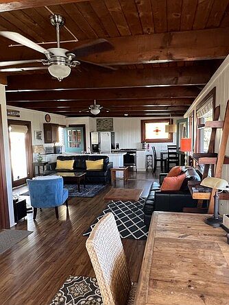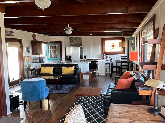Mountains behind the propertyPlenty of outdoor spaceOpen airy cabin feelCozy king bed