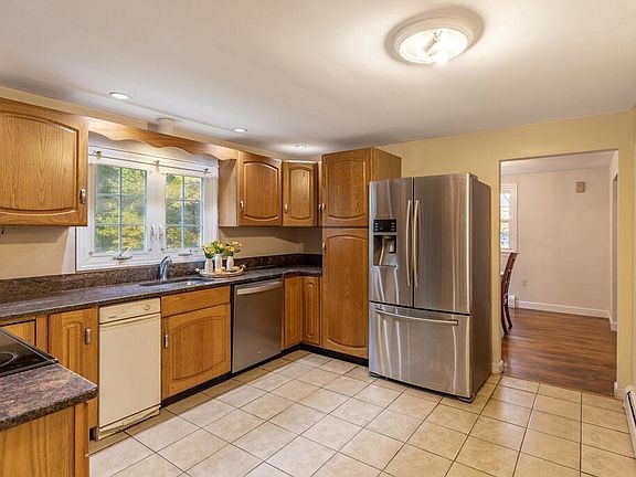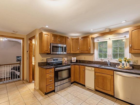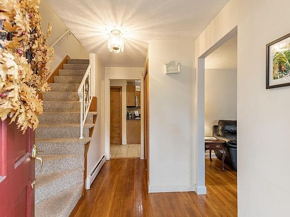 Welcome to this charming garrison. This home features hardwood floors on the main level, a welcoming front foyer, spacious kitchen with upgraded counters, dining room, large living room with fireplace and built-in shelving. First floor half bath conveniently located off of the kitchen. Additional entrance from the driveway opens into a family room with cathedral ceilings, atrium door to deck, patio and large yard. Ascend to the second floor and find a spacious primary bedroom, with two additional bedrooms and a full bath. The finished lower level is perfect for both work and play, complete with additional built-in shelves/desk area. This home also features a one car garage. Located down the street from the Shawsheen School, parks, restaurants and shopping.