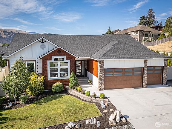 Finest luxury rambler on the market! Custom features include soaring 10' ceilings, immense picture windows, oak hardwood floors, massive stone fireplace PLUS a dream kitchen with Huntwood cabinets, 48” WOLF range and granite island. Located on a peaceful cul-de-sac near the scenic Loop Trail, this home is perfect for an active lifestyle. The primary suite will surpass your expectations - tile/concrete walk-in shower with two rain heads PLUS a “to-die-for” closet system, makeup counter, linen cabinet and water closet. Also includes media room, 40 x 12 RV parking, 25 ft patio, raised beds w/irrigation and low-maintenance yard. Enjoy a cold beverage and Enchantment views from the back yard. This home is second to none in the Wenatchee Valley!