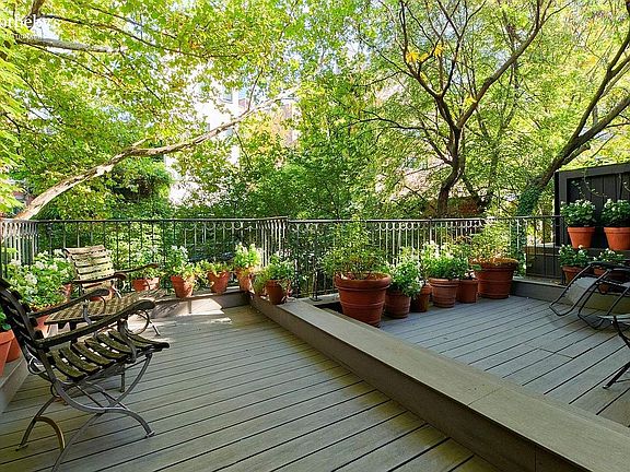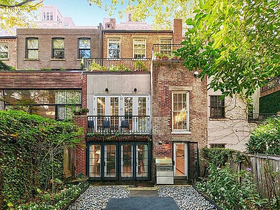 On the third level, you’ll find three bedrooms and a full marble bathroom. Two bright, south-facing bedrooms overlook the tranquil tree-lined street, while a large third bedroom boasts a wood-burning fireplace and a french door leading to a 292-square-foot setback terrace with sweeping views of the gardens and sky, enhanced by reflected sunshine from the nearby glass buildings of Hudson Yards.
