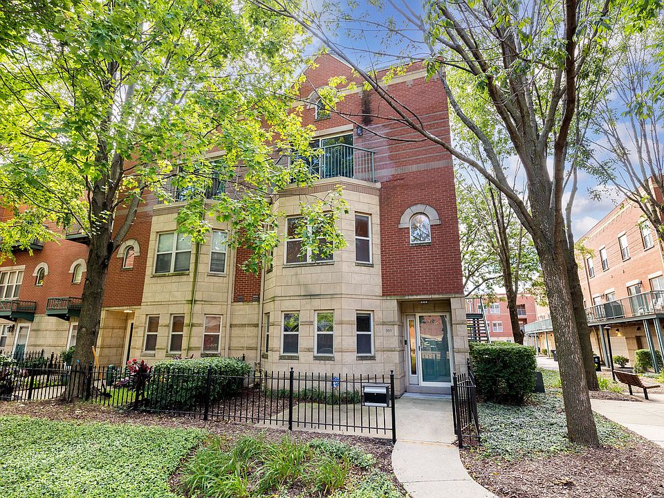 This expansive three-story end-unit townhome offers the perfect blend of space, comfort, and style-all set within a serene, park-like setting that feels suburban yet remains close to everything. As you approach the home, you are greeted with your own gated landscaped patio that lead you to your home. The highlights are its own private entrance and an attached two-car garage, 4 bedrooms, 3 full bathrooms, and three inviting outdoor spaces. Step into the private foyer and discover a versatile first-floor room with its own full bathroom-ideal as a guest suite, home office, or den. The second floor opens into a sun-drenched great room, where curved windows, a cozy fireplace, and an airy layout create a warm, welcoming space. The spacious kitchen offers ample cabinetry, granite countertops, stainless steel appliances, and room for a breakfast table. From here, step out onto a generous balcony-perfect for indoor/outdoor entertaining. Upstairs, a skylight brightens the staircase and hallway, leading to three more bedrooms, two full baths, and a convenient laundry room. The highlight is the oversized primary suite, complete with vaulted ceilings, double closets, a large private ensuite, and a private balcony with stunning views of the Chicago skyline-ideal for morning coffee or unwinding at sunset. Just a short walk to the lakefront, Metra, Hyde Park shops and restaurants, and the University of Chicago, this home truly has it all. Welcome home.