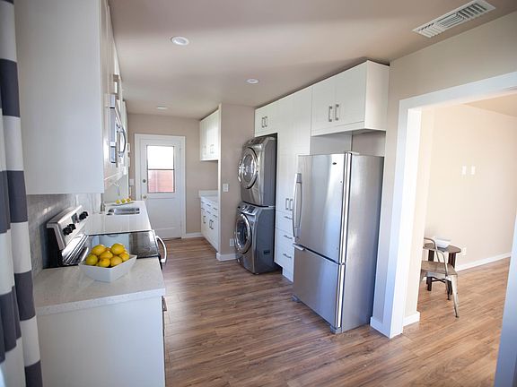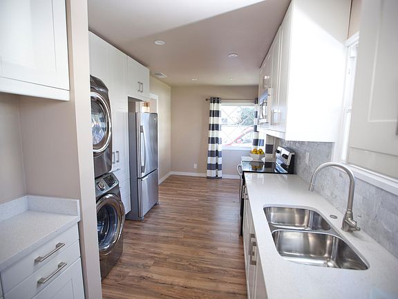 The home has been upgraded and features fresh paint and laminate flooring in the main living areas and bedrooms. All three bedrooms are nicely sized and have upgraded lighting and closets. A stacked washer/dryer is also provided in the kitchen.