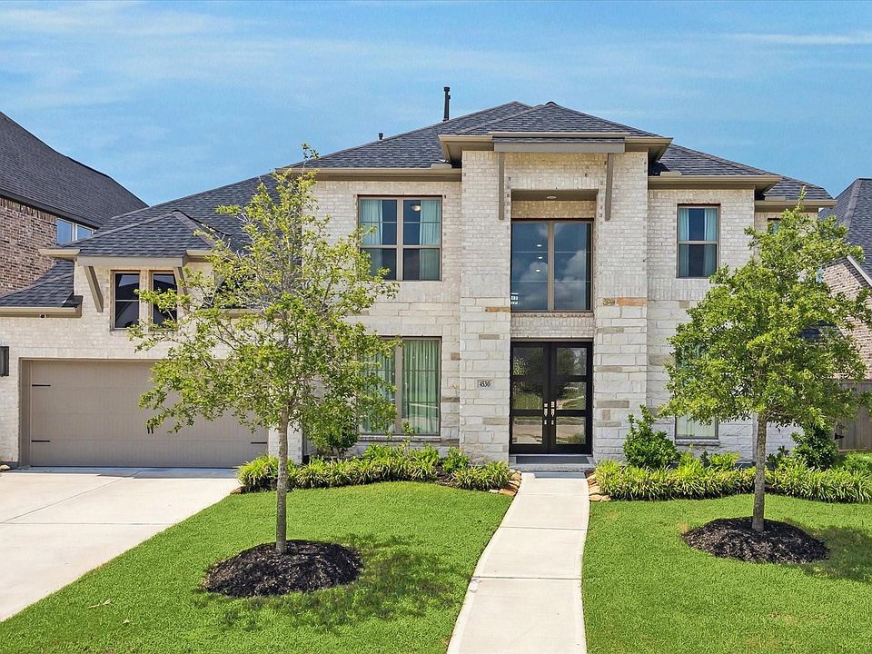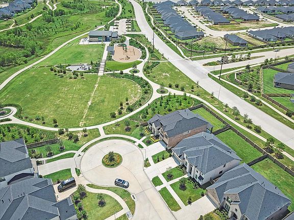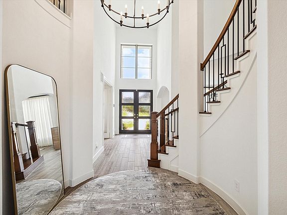 Enter via grand double doors to a spacious main level with wood-look tile, private study, and formal dining. The chef’s kitchen features stainless steel appliances, double ovens, oversized island, stone counters, and butler’s pantry. A two-story living area with gas-log fireplace and walls of windows invites natural light. The primary suite offers a spa bath and dual sided large walk-in closet; a downstairs guest ensuite adds flexibility. Upstairs includes 3 bedrooms, 2 baths, game room, and a media room pre-wired for surround sound—all on stylish LVP. Just steps to 28+ miles of trails, lakes, parks, resort-style amenities, and zoned to top-rated Fulshear High & new Randle Elementary.