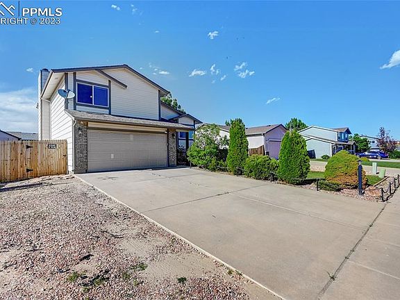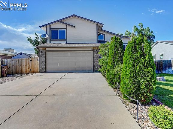 A Beautiful place to call home in Windmill Mesa. This home offers 4 bedrooms | 3 baths | 2 car garage | Corner Lot | additional parking for cars or toys | Stunning landscape and garden | Mountain VIEWS. Quick access to Peterson AFB & Ft Carson, Powers Corridor and I-25. Walking through the front door you are greeted by vaulted ceiling, slate tile entry into dining room, and spacious kitchen with LOADS of cabinet and countertop space...all kitchen appliances are included. Just off the kitchen through large sliding glass door you can rest easy on your SPACIOUS deck with stunning VIEWS of the FRONT RANGE and PIKES PEAK. A few steps down enjoy your beautifully landscaped and maintained backyard...from ROSES to RHUBARB and luscious GREEN GRASS this yard gets two GREEN THUMBS UP! Spacious storage shed in backyard is included for additional parking of tools and toys! The lower level offers a spacious living room with WOOD burning FIREPLACE and CUSTOM mantle and plenty of wood to burn for winters to come! Finished basement includes bedroom with DUAL CLOSETS, full BATH, and utility/laundry space. The upper level holds primary bedroom with ensuite 3/4 bath. Two secondary bedrooms and a full bathroom! Two car garage has thoughtfully laid out shelving, STORAGE, beefy workbench, and built in cabinets. Additional 220V electrical connect in garage is ready to connect for wood working shop tools, welder, or charge up your EV. Welcome Home!