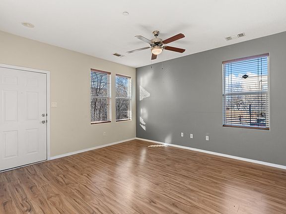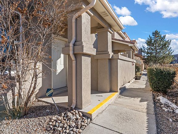 Amid the tall trees of this large corner setting, this newly updated home is in the Rancho Santos Condominiums, conveniently located in the Southside of Santa Fe. This two-story home has panoramic views of the Jemez and Sandia mountains from the upstairs bedrooms, which include a large owners suite with huge walk-in closet, double vanities and a laundry room. There are tall ceilings throughout the home, adding to the spacious and bright feeling. Downstairs one will note the striking hickory floors of Pergo laminate and the open floorplan that merges the living, dining rooms and the large kitchen. There is ample cabinet space with soft-close hinges and new butcher block counter tops. The appliances are stainless steel, with a microwave/hood combination. There is direct access to the finished 2- car garage, and a very useful pantry. The dining area has patio access and overlooks the living room. The space feels light and inviting. There is a bedroom downstairs, with walk-in closet and adjacent bath that could also function as a private office or studio. This unit has forced air heat and central air-conditioning. Just minutes to I-25, shopping, restaurants and medical facilities.