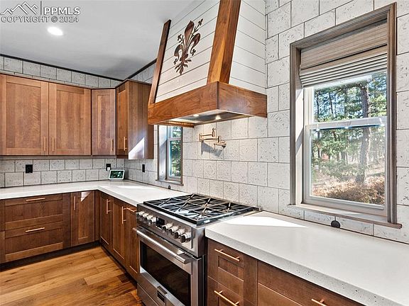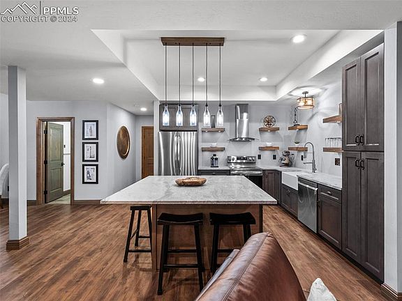 Nestled in the sought-after Perry Park neighborhood, just a mile from HWY 105, this stunning 5-bedroom, 5-bathroom residence offers a resort lifestyle with modern charm and rustic elegance. Built in 2019, this meticulously crafted home boasts thoughtful landscaping and window treatments, inviting you to simply move in and enjoy.    Step inside to discover a spacious and airy open concept layout, highlighted by a chef's kitchen, a dining room with a built-in buffet, and a dramatic great room featuring a wood-paneled feature wall and fireplace. The main level also hosts a tranquil owner's suite, complete with a spa-like bathroom and a convenient work-from-home office.    Downstairs, the walk-out basement provides ample space for multi-generational living, featuring an additional full-size kitchen with an exterior entry, perfect for guests or extended family members. A second primary bedroom with an en-suite bathroom boasting a rain shower and sauna completes the lower level, along with plenty of room for entertainment, with space for large screen TVs, exercise equipment, and game tables.    Outside, two outdoor patios beckon for relaxation and gatherings, offering privacy, tranquility, and views of the Pike National Forest. The fenced-in dog yard with K9 grass is perfect for furry companions, while the private pergola-covered oasis features a built-in firepit surrounded by wood swings and benches, creating an idyllic setting for unforgettable moments with family and friends.    For car enthusiasts, the oversized heated 3-car garage provides ample space, with cutouts for natural light and an additional parking spot graded and graveled for a camper or extra vehicle.    Experience the ultimate Colorado retreat in this unique and impeccably designed home, where every detail has been carefully curated for luxurious living.