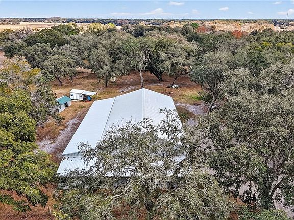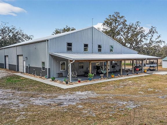 This exceptional 20-acre homestead retreat features a massive 6,000-square-foot Barndominium thoughtfully designed with two separate living quarters on opposite ends, ideal for multi-generational living, guest space, or dual households seeking independence under one roof. The expansive center part of the Barndo offers unmatched flexibility with room for substantial storage, a workshop, equipment housing, farm operations, or even an indoor basketball court. A full wraparound covered porch invites you to slow down and enjoy peaceful sunrise and sunset views across your acreage. With two wells supporting agricultural and residential use, an RV hookup, multiple outbuildings, and space ready for horse stalls, this property is primed for sustainable living. The land offers abundant opportunity for gardening, raising livestock, establishing orchards, building greenhouses, installing chicken coops, or creating rotational grazing pastures. Approximately 10 acres are currently used to harvest and sell sod twice a year, providing built-in income potential to offset taxes and insurance while maintaining agricultural exemption benefits. A modular home on site can be renovated into a rental, caretaker’s quarters, or a true mother-in-law suite, perfect for extended family or additional homesteading partners. Mature moss-draped oak trees frame a good portion of the property, creating shade, beauty, and natural habitat, while the dead-end private road ensures peace and privacy. Located just outside of town yet conveniently near I-75 with easy access to Tampa, Orlando, and Ocala, this rare property delivers the ideal balance of self-sufficiency, income-producing potential, and country living with city convenience! This is a true turn-key homestead opportunity ready for your vision and income producing abilities ahead.