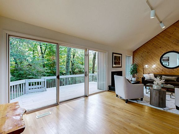 Lush one-acre lotSerene private retreatVaulted ceilingsLovely deckBeautiful wooden accent wall
