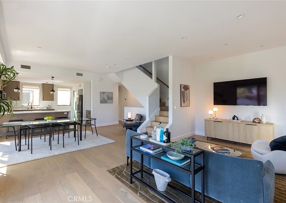 As you enter through the smart home entry, you're greeted by a private, enclosed front patio— Inside, the home exudes a contemporary yet welcoming ambiance with Garrison wide plank wood floors, expansive windows, and motorized Vertilux roller shades to create the perfect atmosphere.