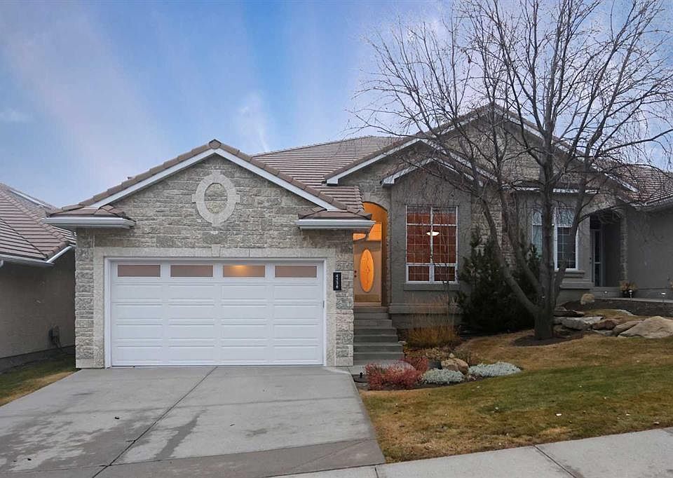 Rare opportunity here in Calbridge’s exclusive villa complex of CHATEAUX ONE, in this highly-coveted location backing onto the prestigious Hamptons golf course. Offering over 2600sqft of refined luxury living, this exquisite 2 bedroom + den villa enjoys relaxing central air & granite countertops, beautiful maple floors & 2 fireplaces, fully-loaded chef’s kitchen & panoramic views of the golf course. Complemented by soaring 12ft ceilings & bathed in natural light, the air-conditioned main floor of this fully finished bungalow features an expanse of floor-to-ceiling windows, elegant formal dining room accented by stately columns, wonderful living room with gas fireplace & open concept dining nook with access onto the backyard balcony. The gourmet maple kitchen is simply stunning & has rich custom cabinets & granite counters, large walk-in pantry & the upgraded stainless steel appliances include Bosch dishwasher & GE stove/convection oven. The relaxing owners’ retreat has a big walk-in closet & sleek ensuite with skylight & tile floors, jetted tub & glassblock shower. The walkout level is beautifully finished with a 2nd bedroom with walk-in closet, full bathroom, an unbelievable amount of extra space for storage (or future home gym or workshop) & sensational games/rec room with fireplace, extensive built-ins & Murphy bed. Main floor also has a dedicated home office with glass French door & laundry room complete with sink, built-in cabinets & LG washer/dryer. New epoxy floors in garage & carpets in 2025, hot water tank replaced in 2019. The lucky residents of CHATEAUX ONE also don’t need their lawn mower or shovel because grass cutting & snow removal are covered by the monthly maintenance fees & irrigation for the underground sprinkler system is also included. A truly outstanding home in this sought-after golf course community, within walking distance to the golf course clubhouse & bus stops, only minutes to neighbourhood amenities & shopping, & easy access to major retail centers, Crowfoot Centre & LRT, top-rated schools & hospitals, University of Calgary & downtown.