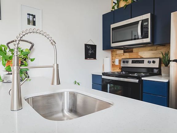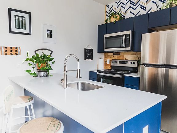 Custom Kitchen & Dining: The centerpiece is the stunning kitchen, featuring rich navy blue flat panel cabinetry and a generous island with sleek white quartz countertops. The overhead accent wall with a blue and white chevron pattern and a touch of reclaimed wood paneling provides fantastic visual appeal. It's fully equipped with stainless steel appliances and bar seating for easy entertaining.