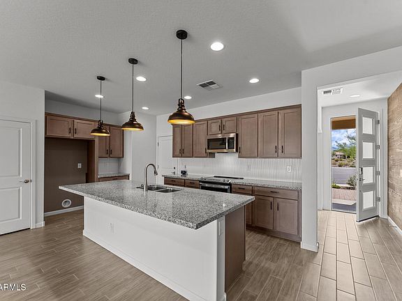 Located in the sought-after resort-style community of Wickenburg Ranch, this stunning home epitomizes modern desert living with its thoughtful design and luxurious features. The open floor plan seamlessly integrates indoor and outdoor spaces, highlighted by a large wall of sliding glass doors that lead to a covered patio that's perfect for relaxing or entertaining. A serene water feature creates water sounds for ultimate relaxations. The sleek, upgraded kitchen serves as the heart of the home, boasting contemporary finishes, high-end appliances, and an oversized island for gathering and meal preparation. Abundant natural light flows throughout the home, creating a bright and airy ambiance. With two spacious bedrooms, two well-appointed bathrooms, and a versatile den that can serve as an office or hobby room, the home offers both comfort and practicality. The garage provides ample storage and workspace, making it ideal for active lifestyles. This home is located on a cul-de-sac with a fully fenced yard. Surrounded by the beauty and amenities of Wickenburg Ranch, this home offers a unique blend of elegance, functionality, and resort-style living. Don't miss the chance to make this house your home.