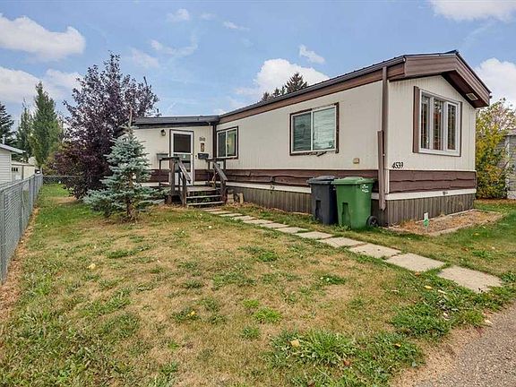 Affordable Living with an Oversized Lot! Check out this 3 Bedroom, 2 Bathroom Mobile with covered decks on each side of the home. Back yard has back alley access to the more than full sized lot that includes a Fire-pit, Tarp Shed, Shed, and plenty of trees throughout the fully fenced yard. Inside you'll find a functional open layout, including a large living room area, large kitchen with pantry, and plenty of white cabinets. There's also a 3 piece ensuite in the Primary Bedroom, full laundry closet, along with a 4 piece bathroom, and two more bedrooms (one is currently being used as an office). Additional features include a 50 Amp RV plug in, power to the shed & tarp shed (garage).