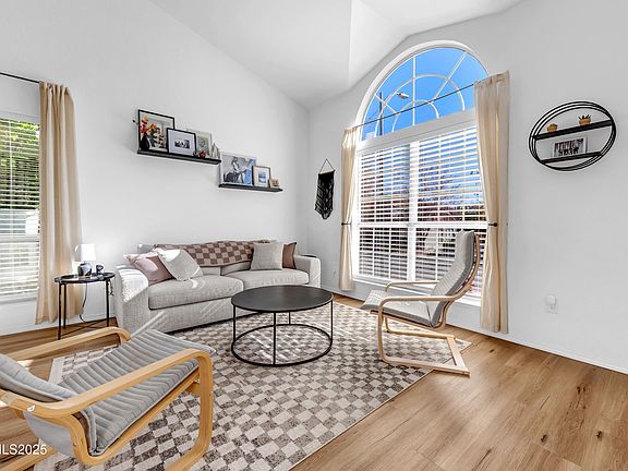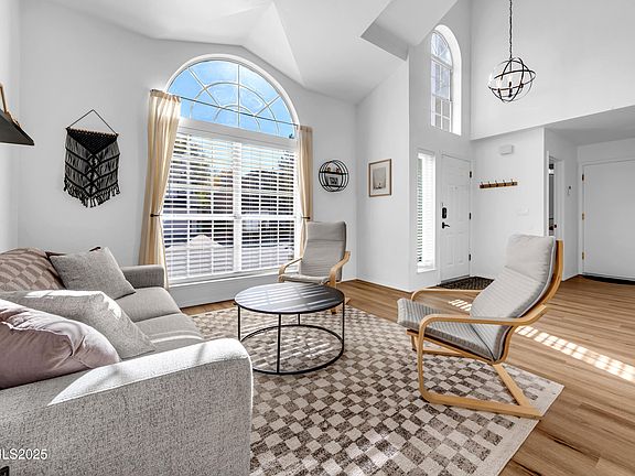 Located in West Reno at the crossroads of function, style & comfort, this beautifully updated 3 bedroom, 2 1/2 bath, 2 car garage home has almost 2000 SF of well designed living space. Entry opens to a living/dining room with vaulted ceiling & sunshine that fills the room, plus 1/2 bath near garage door entry on main level. Toward the back, kitchen with island, pantry, stainless appliances, sleek countertops and dinette area adjoining cozy family room with gas log fireplace. Light tone solid surface laminate flooring, attractive light fixtures & window blinds throughtout the home. Upstairs 3 bedrooms including primary bedroom with high ceiling, spacious bathroom, garden tub, extended countertop with double sinks & walk-in closet. 2 additional upstairs bedrooms, one with small walk-in closet & hall bathroom with tub/shower combo. Relaxing backyard with large deck, bench seating, roomy storage shed or optional workspace, lawn area and mature landscaping. Lovely neighborhood park nearby, close to shopping and numerous amenities. This home sparkles, don't miss it!