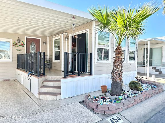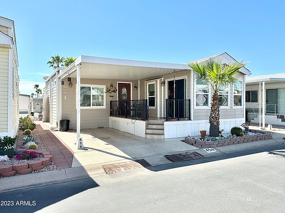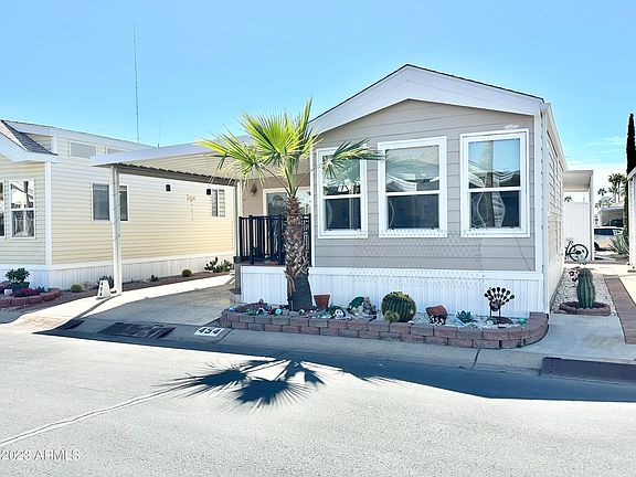 WHAT A STUNNER....DON'T MISS LOOKING AT THIS HIGHLY UPGRADED 1996 Park West Elite w/ LARGE SPACIOUS AZ ROOM ADDED IN 2006! Ideally situated NORTH FACING W/CAPTIVATING MOUNTAIN VIEWS! ENJOY the DELIGHTFUL outdoor GRAND TILED DECK perfect for RELAXING & taking in the AMAZING AZ SUNSHINE! FANTASTIC CURB APPEAL W/ COATED CARPORT! STEP inside and you will find a GREAT OPEN CONCEPT FLOOR PLAN w/ plenty of room for entertaining & for all your guests to come stay! 1 bed, 1.75 bath w/ additional back room office, laundry area w/ stackable washer/dryer & an EXTRA back storage room w/ access door to the outside! GORGEOUS WOOD LOOK LAMINATE FLOORING THROUGHOUT great for easy care! LARGE front living space off THE GOURMET KITCHEN w/ FULL SIZE STOVE, NEWER MICROWAVE & YES...A FULL SIZE DISHWASHER, NEW STAINLESS SINK W/ FAUCET along w/ upgraded neutral color cabinets & countertops w/ fabulous cooking counter space! NICE pull out drawers in kitchen cabinets as well. LOVELY pull down soft shades add a great touch! NICE SIZE BEDROOM W/ KING SIZE lift & store bed, mirrored closet & dresser drawers! NEWER FURNITURE & READY TO MOVE IN! DUAL PANE WINDOWS, NEW ROOF IN 2021! TOO MUCH TO LIST ON THIS WELL LOVED HOME..THE LIST GOES ON! Come enjoy our amazing 55+RESORT WHERE YOU OWN THE LAND.....OWN THE FUN!