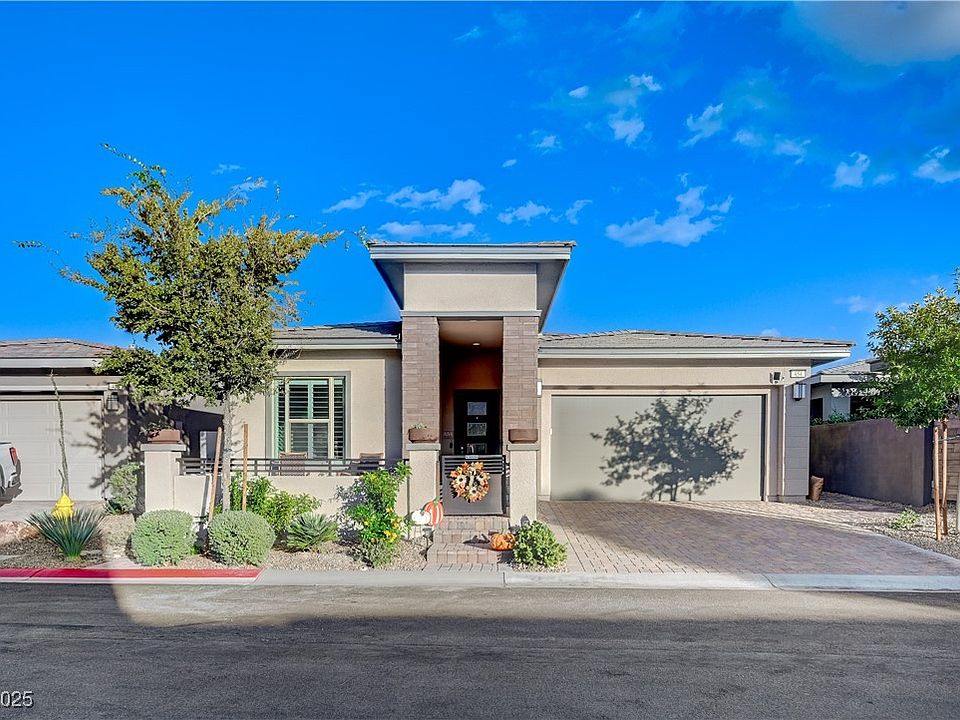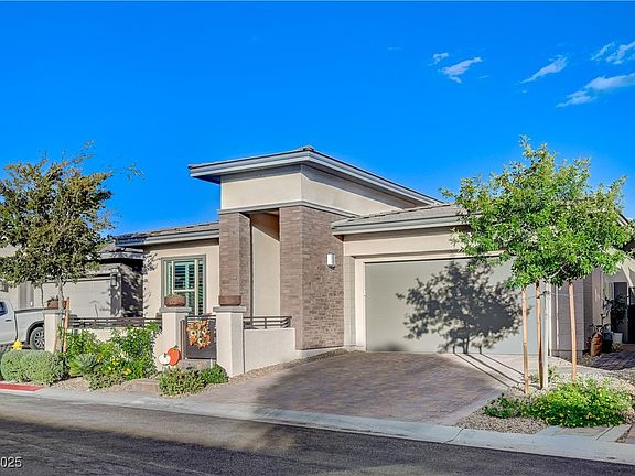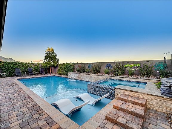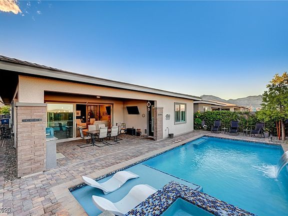 This immaculate single story home is the perfect combination of style and sophistication. Arrive to beautiful curb appeal with gated courtyard entry, and step into the elegantly designed open concept living space offering comfort and luxury. Fall in love with the natural light, tile flooring, neutral color palette and stunning finishes. Create unforgettable memories entertaining in the chef's dream kitchen and resort - style backyard. Enjoy relaxing evenings on the oversized covered patio with built in grill and mini fridge, while admiring the mountain views from the shimmering pool and spa. Experience the convenient location near shopping, dining, Red Rock and Downtown Summerlin. Enjoy the great outdoors living in the sought after Stonebridge Village Community, just moments from the 11 acre Stonebridge Park offering pickleball, basketball, soccer fields, picnic and play area.