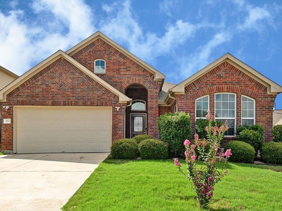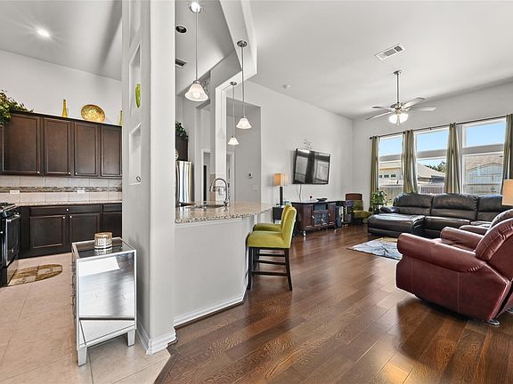 Step into comfort and style in this stunning single-story home, offering just over 1,800 square feet of thoughtfully designed living space. With soaring ceilings, brand new carpets, real engineered hardwood floors, and an open, airy layout, this 3-bedroom, 2-bath home creates a grand yet welcoming atmosphere from the moment you walk in. The spacious living and dining areas flow effortlessly, making it perfect for entertaining or simply relaxing at home. At the heart of the home is a beautifully appointed kitchen, featuring elegant granite countertops, a generous breakfast bar, and striking architectural details that invite your personal touch. Natural light pours in through large windows, highlighting the home’s warm finishes and modern charm.The private primary suite offers a peaceful retreat, complete with a spa-inspired bath that includes dual vanities, a soaking tub, and a separate walk-in shower. Versatility is key, with one of the secondary bedrooms easily doubling as a home office, hobby room, or guest space. Additional perks include a washer, dryer, and refrigerator—all included in the sale—an attached two-car garage with ample storage, a separate shed, and a generous backyard perfect for weekend gatherings, playtime, or quiet evenings under the stars. Nestled in the vibrant Sunfield community, residents enjoy resort-style living with amenities like fishing ponds, open-air pavilions, a junior Olympic-sized pool, dual lazy rivers, and community events that bring neighbors together. With quick access to IH-35 and Toll Road 130, this home offers the perfect blend of peaceful living and city convenience. A rare gem and the ideal place to begin your next chapter—don’t miss your chance to call this dream home yours!