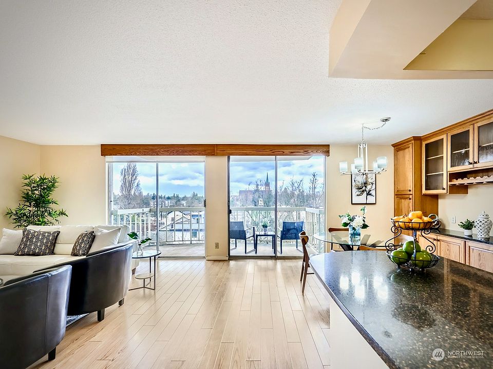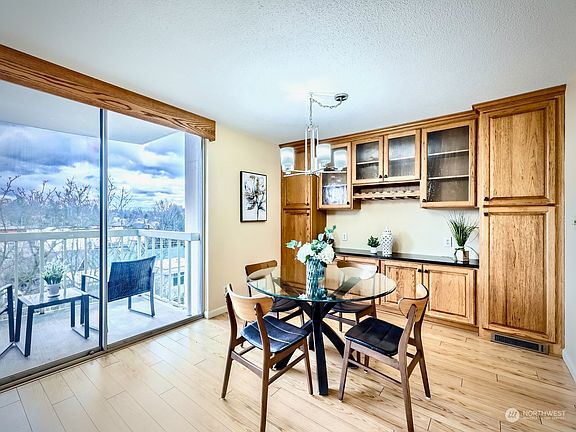 Bright and inviting 2bed/1.75bath condo in iconic University Plaza. You will love the open floorplan, large windows, rays of sunshine into each room & the amazing territorial views from your private balcony. Home features a huge living & dining room w/custom built-ins, kitchen w/granite counters & SS appliances, hardwood flooring. Relax in your primary ensuite w/full bathroom & a his/her closet. A versatile 2nd bedroom offers built-in desk & Murphy bed tucked behind gorgeous wood cabinets. Concrete/Steel bldg w/concierge/security service, gated parking garage, EV Charging, pool, gym & extra storage. Quick access to all your destinations incl. Trader Joe, restaurants, UW, & I-5. HOA covers all utilities plus bldg maintenance. No Rental Cap.
