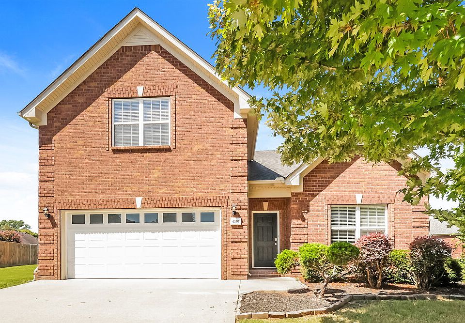 Come tour this spacious two-and-a-half bathroom rental home in Tennessee with three bedrooms and two and a half bathrooms. Vaulted ceilings keep the living room feeling roomy, while a fireplace brings cozy vibes for cold nights. Black appliances contrast against the kitchen's oak-colored cabinetry, while hardwood flooring lends a luxurious feel. The master suite's tray ceiling opens up the room. The en suite bathroom features a dual vanity along with a step-in shower.