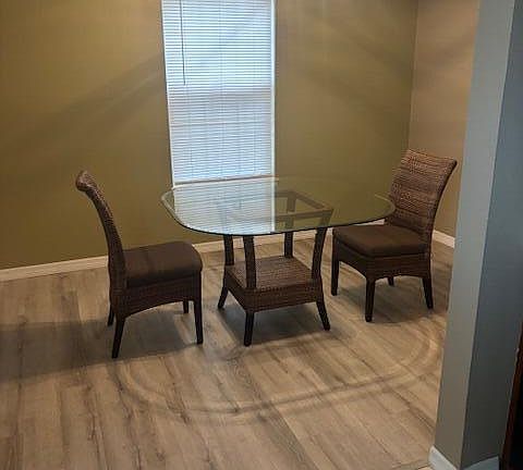 The home features updates including laminate wood flooring in the main living areas and ceramic tile in the kitchen and baths. Each bedroom has its own private suite—one with a step-in shower, the other with a shower/tub combination—making this an excellent option for both comfort and privacy. The kitchen includes a cozy dinette space, open to the living area, while the screened-in back porch provides additional living space and houses the washer, dryer, and hot water heater in a dedicated closet.