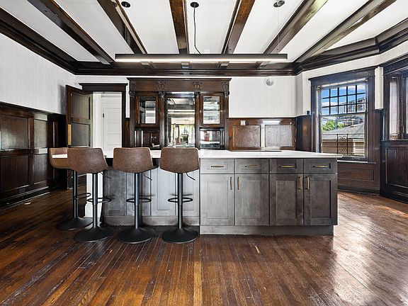 = The show-stopping kitchen centers on a stunning quartz-topped 10-foot entertaining island with an L-shaped seating area against the backdrop of original walnut high-paneled wainscoting, a built-in mirrored buffet cabinet, and beamed ceiling. Bespoke black steel appliances include a smart induction range and Whisper Quiet dishwasher.
