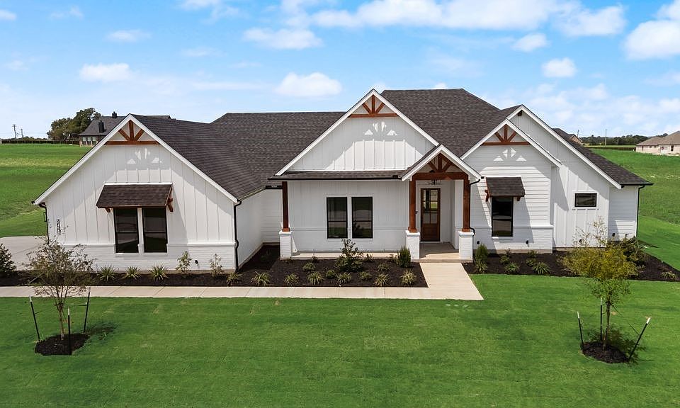 RATES STARTING AT 3.99 Rate for a limited time only in the property--Restrictions Apply. Welcome to this stunning CUSTOM NEW BUILD modern farmhouse on a full acre in the prestigious Bison Meadows community of Waxahachie. Perfectly located just south of Dallas, this home offers the charm of scenic farmland with the convenience of city access. From the upgraded rustic brick exterior and gabled rooflines to the manicured lawn, curb appeal abounds. Inside, warm wood flooring, soaring ceilings, and natural light set the tone. A private office with French doors sits just off the entry. The expansive living room features cedar beams, a striking 60-inch linear fireplace with full-height tile surround, and a wall of windows overlooking the backyard. The gourmet kitchen offers quartz countertops, an oversized island with seating, electric cooktop, pot filler, walk-in pantry with built-ins, and FAMOUS Costco access door to the garage. The serene primary suite includes tray ceilings, dual vanities, a soaking tub, custom double shower, and an oversized walk-in closet. Three additional split bedrooms provide flexibility, including one with its own private en-suite bath. A custom mud bench, powder room, and utility room with sink and cabinetry add convenience. Step outside to the extended covered patio with tongue-and-groove ceiling—perfect for relaxing or entertaining. This isn’t your typical home—it’s the best in the neighborhood, showcasing exquisite style and unmatched craftsmanship. With over $50,000 in upgrades including engineered foundation with piers, spray foam insulation, 8-ft interior and garage doors, upgraded electrical wiring, holiday lighting connection, generator-ready hook-up, decorative beams, designer finishes, and premium rustic brick. Highly regarded Red Oak ISD and just minutes from Waxahachie parks, dining, and shopping, this property offers the best of luxury, function, and location. Don’t miss your chance to own this exceptional home!