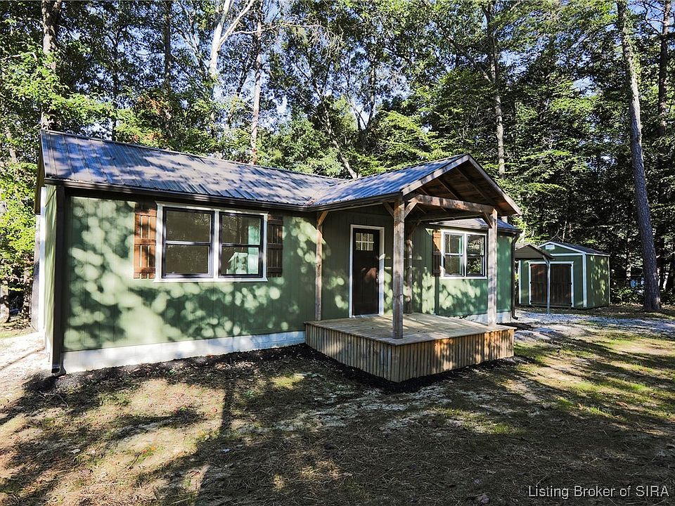 Nestled on nearly an acre of private, wooded land, this newly constructed cottage offers the perfect blend of modern comforts and rustic charm. A welcoming walkway leads to the covered front porch, setting the tone for this enchanting retreat. Step inside to an open floor plan where the kitchen and living area flow seamlessly together, filled with natural light. The kitchen shines with gleaming white craftsman-style cabinetry, butcher block countertops, and a full appliance package including oven range, microwave, dishwasher, and refrigerator—everything you need to settle right in. The bedroom is a true haven, featuring vaulted beam ceilings that mirror the character of the living space, ample closet space, and a lofted storage area for added convenience. The bathroom offers thoughtful touches like linen and supply cubbies, and even includes a washer and dryer. Start your mornings with coffee on the rear deck, overlooking the tranquil wooded backdrop. Outside, you’ll also find a newly built 10x10 shed that complements the home’s architecture, along with covered carport parking. Whether you’re searching for a cozy primary residence, a peaceful weekend retreat, or a charming Airbnb-style investment, this property checks all the boxes. Don’t miss your chance to make this fabulous cottage your own!