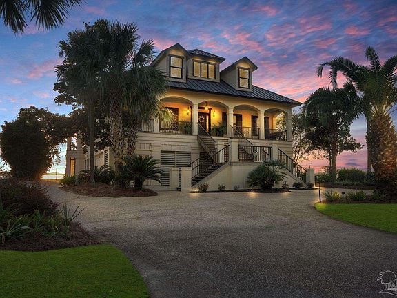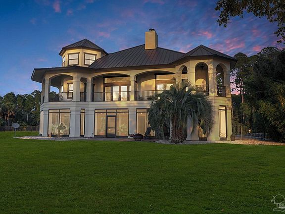 Salt + Serenity Home commands an unparalleled waterfront position on Escambia Bay, offering sweeping 270° views & the ultimate coastal lifestyle. Set on an elevated, professionally landscaped lot in the exclusive Bayside North Island community, this extraordinary estate combines timeless architectural elegance with modern luxury. Approach via a circular driveway to an imperial staircase leading to a covered balcony and grand entrance framed by classical arches and decorative columns. Inside, soaring hand-painted metal ceilings, rich pine floors, and a dramatic spiral staircase that leads to a bonus crow's nest with stunning views. Large windows & French doors flood the home with natural light while perfectly framing the serene bay vistas. At the heart of the home, chef’s kitchen boasts a granite-topped island, a breakfast bar, a professional-grade gas range with double ovens, stainless steel appliances, and abundant custom cabinetry. The adjoining living areas feature a formal dining room, elegant sitting room, a grand family room with custom banquette, statement fireplace, & expansive water views. An office with bay views offers functional yet stylish workspaces. The primary suite is a true retreat, featuring lofty ceilings, French doors to the bay, and a spa-inspired bath. An additional guest suite with private bathrooms is located on the main level. Upstairs, you will find 2 more bedrooms, a guest bath, and a reading nook. Outdoor living is elevated with expansive covered decks, wrought iron fencing, and lush landscaping—an entertainer’s dream. The ground level offers a four-car garage, workshop, and spacious screened lanai ideal for large events cookouts. The backyard boasts ample room to accommodate a pool (virtually shown) or private dock. Deep-water access makes this property perfect for boating, fishing, and paddleboarding. This isn’t just a home—it’s a legacy, a retreat, and your front-row seat to life on the bay. Schedule your private tour today.