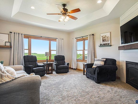 Inside, the main floor offers inviting living spaces with large windows that frame peaceful country scenery. The living room features a tray ceiling, propane fireplace, and plush carpet for cozy gatherings. The open kitchen and dining area are ideal for entertaining, showcasing wood floors, Cambria quartz counters, center island with seating, walk-in pantry, and stainless appliances. French doors lead to the upper deck—perfect for morning coffee or watching sunsets.