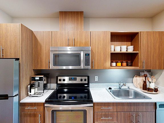 - Exterior features: 30-day lease guarantee, Balcony, Bi-weekly payment program, Bicycle storage, Build credit score with RentTrack, Deposit free with Rhino, Electric car charging station, Flooring: Wood, Home purchase plan, Lifestyle services powered by Amenify, Media Room, Moving services with Move Matcher, Package Receiving, Pet friendly community, Quartz countertops, Resident App, Short Term Lease, Smart home + GiGstreem Internet, Stainless steel appliances, Sundeck, View Type: Stunning views