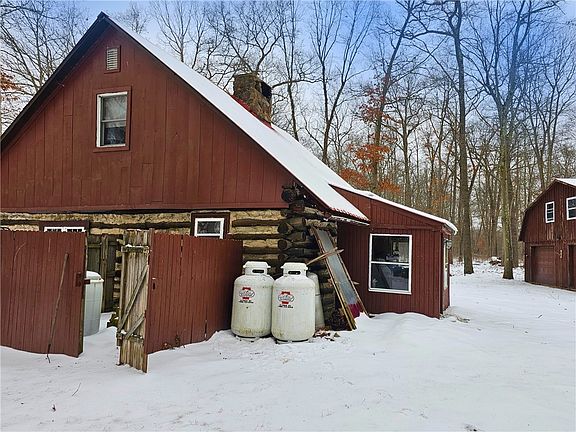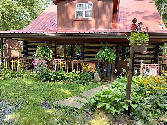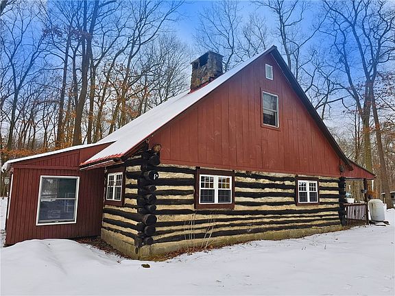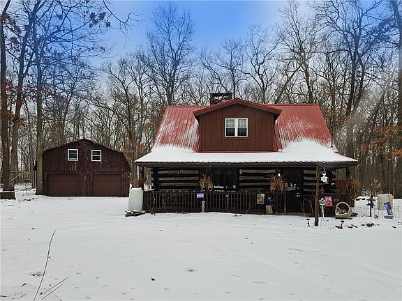 Handcrafted log cabin on 3 flat serene acres bordering Collins PA Forest. Built by its original owner with on-site logs and stones, this 3-bedroom, 1-bath home is a rustic retreat with modern potential. A stunning stone chimney features two fireplace inserts for warmth and ambiance. The detached two-car garage includes a spacious loft, ready to be finished as a guest suite, studio, or storage. Enjoy direct access to Public Game Lands for hiking, hunting, and outdoor adventure. Just minutes from Tionesta’s charming shops, dining, and scenic Allegheny River. A rare opportunity for nature lovers seeking peace, privacy, and craftsmanship in a truly unique home. Don’t miss out!