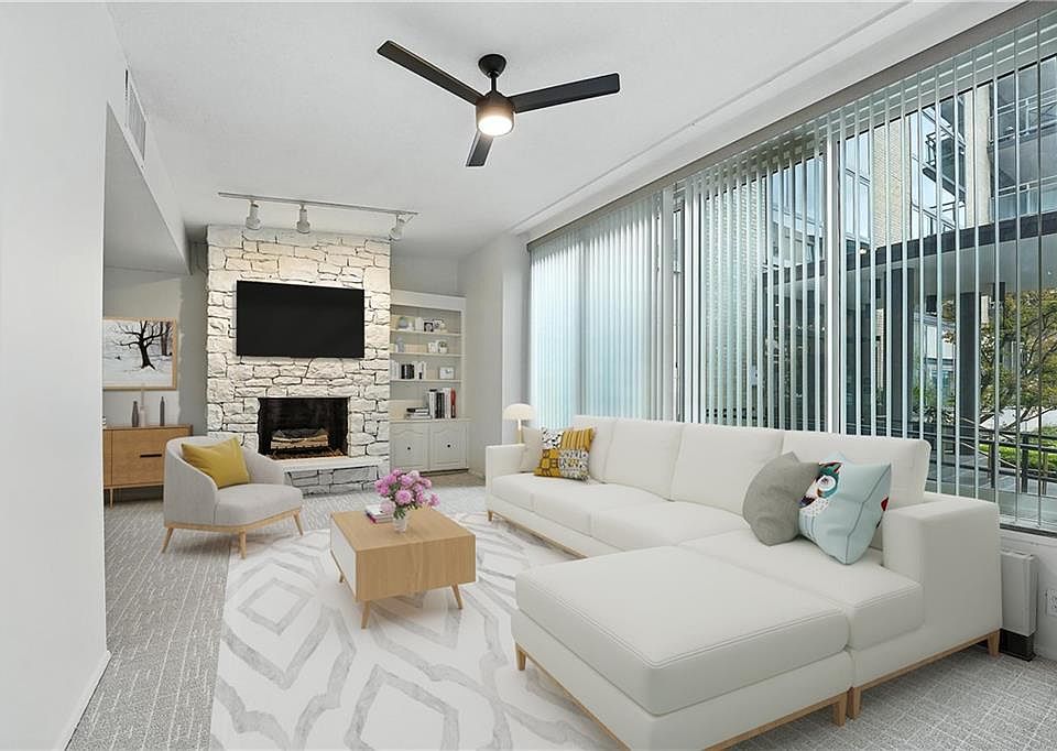 This is one of the only condos in the building with 9 ft tall ceilings with fireplace facade. Brand new carpet runs throughout the unit, fresh paint, complemented by tiled kitchen floors, dishwasher, refrigerator, microwave, and oven/range. This spacious studio features large windows that fill the room with natural light and has all new light fixtures from Wilson Lighting. The oversized front closet will fit all your coats with plenty of space to double as a pantry. The HOA fees are one of the lowest in the building and INCLUDES HEATING AND COOLING, and water. Owner only pays for electricity in your unit and internet/cable. This unique unit has a secured garage space and dedicated storage. The building has undergone multi-million dollar renovations, including a stunning lobby, updated exterior, and refreshed common areas all monitored by a friendly 24/7 front desk staff. Residents enjoy two community lounges, a fitness center, large laundry facility with new machines, and a rooftop deck overlooking Mill Creek Park. Just one block from Mill Creek Park and St. Luke's Hospital, this unbeatable location offers a vibrant, low-maintenance lifestyle in the heart of KC.