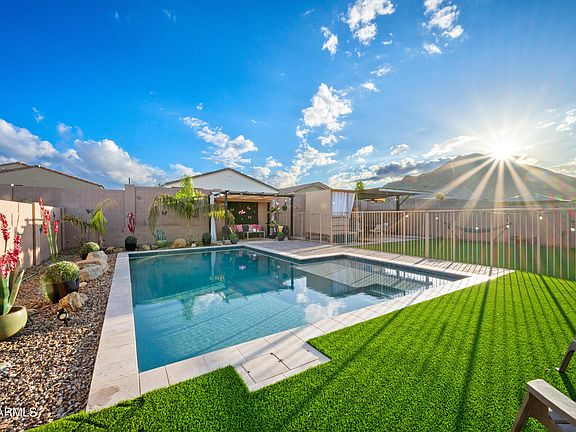 Built in 2021, this stunning 3-bed, 2-bath beauty is move-in ready and designed for fun! Complete with an upgraded interior package, open layout, perfect for entertaining with stylish finishes throughout. Step outside and enjoy your huge backyard paradise with a sparkling pool and baja shelf, covered patio, low-maintenance turf and hardscape, plus two pergolas for added shade to enjoy the outdoors. Soak in breathtaking mountain views while relaxing or hosting memorable gatherings. Best of all, the backyard is already finished, giving you instant enjoyment without the hassle. A rare RV garage with front and back access provides incredible flexibility for storage and toys. Additional upgrades include epoxy-coated garage floors and a water filtration system. Don't miss this one!