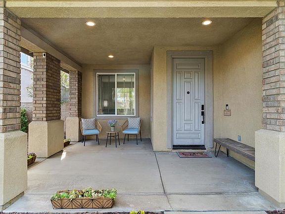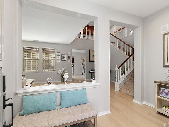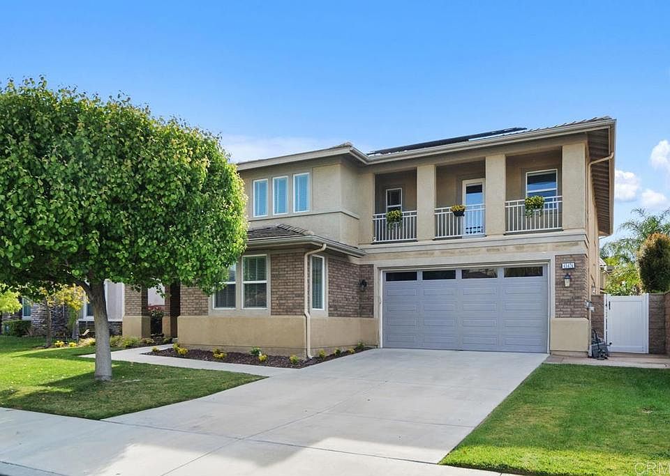 Welcome to this beautifully upgraded two-story home tucked away on a peaceful cul-de-sac in the prestigious Wolf Creek Community of Temecula. This spacious residence offers 5 bedrooms and 3 full baths, including a convenient first-floor bedroom and full bath—ideal for guests or multi-generational living. Designed with both comfort and efficiency in mind, this home boasts numerous upgrades, including laminate flooring, a HALO whole-house water filtration system, and 29 solar panels with a NeoVolta 14 backup battery. The garage is fully finished with polyaspartic-coated floors and its own wall-mounted HVAC unit for climate control. The low-maintenance backyard is complete with artificial turf, fruit trees, and a covered patio complete with dual ceiling fans and lighting. The elegant layout features high ceilings, a formal living room and a large formal dining room with views of a tranquil courtyard, perfect for indoor-outdoor entertaining. The chef’s kitchen boasts a grand granite island, abundant cabinetry, stainless steel appliances including a 4-door French door smart refrigerator, and a cozy breakfast nook. Upstairs, you'll find four generously sized bedrooms as well as an office nook. The master suite features dual vanities, a soaking tub, separate shower, and a large walk-in closet. Two bedrooms open to a private balcony with mountain views. Additional features include dual HVAC systems, a spacious 3-car tandem garage [651 sq ft], and a dedicated laundry room equipped with a smart washer and dryer. Conveniently located just minutes away from the San Diego County line, this home also offers easy access to top-rated schools like Great Oak High School, the 15 and 215 freeways, Old Town Temecula, Wine Country, and more. Wolf Creek residents enjoy premier amenities such as a community pool / spa, fitness center, clubhouse, and outdoor barbecue areas. With multiple parks, golf courses, bike paths, splash pads, and a 44-acre sports park (Patricia H. Birdsall Sports Park) nearby, this is the perfect place to call home.