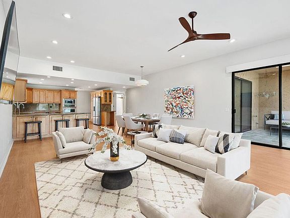 Experience desert living in this beautiful 3-bedroom, 2-bath Sandpiper Condominium at the exclusive, guard-gated Indian Wells Country Club. Enjoy 1,875 sq. ft. of open living space, complete with a spacious two-car garage and golf cart garage. Step inside to a bright, open floor plan with premium luxury vinyl plank flooring throughout the main areas and in two of the bedrooms. The kitchen features elegant granite countertops and bar seating, flowing seamlessly into the dining and great room. Sliding doors lead to an expanded, tiled patio--perfect for relaxing or entertaining while taking in stunning Santa Rosa Mountain views. The primary suite is a peaceful retreat with a walk-in closet and private patio access. Two guest bedrooms open to a tranquil atrium, ideal for quiet moments. Over $65,000 in recent upgrades--including premium luxury vinyl plank flooring, plush new carpets, window treatments, an exterior shade, shower doors, and a patio extension--add to the home's appeal. This property is located within walking distance to the world-renowned BNP Paribas tennis tournament, offering unparalleled access to one of the most prestigious sporting events in the area. As an Indian Wells City resident, enjoy exclusive perks like discounts at local restaurants and access to the renowned IW Golf Resort. Discover the perfect blend of comfort, style, and vibrant desert living in the heart of Indian Wells.