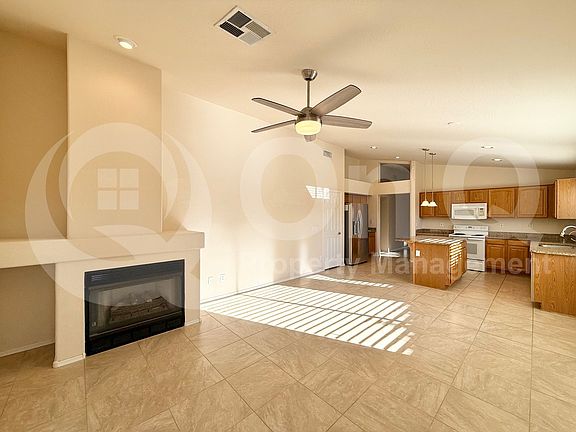 Available Now! 1,732 SQ FT single-story home featuring 3 bedrooms and 2 bathrooms. The kitchen includes a refrigerator, oven, microwave, dishwasher, water softener, and RO system, with a breakfast bar perfect for casual dining. The living room offers wood floors, ceiling fans, and large windows that bring in plenty of natural light. The primary suite features a spacious walk-in closet and a private ensuite bath. Two additional bedrooms share a full guest bathroom with modern fixtures. The laundry room comes equipped with a washer, dryer, and extra storage space. A two-car garage with a garage door opener provides convenient parking. The backyard offers serene desert views and frequent sightings of local wildlife, creating a peaceful outdoor setting. Located within a quiet HOA community, this home combines comfort and nature with easy access to nearby amenities.