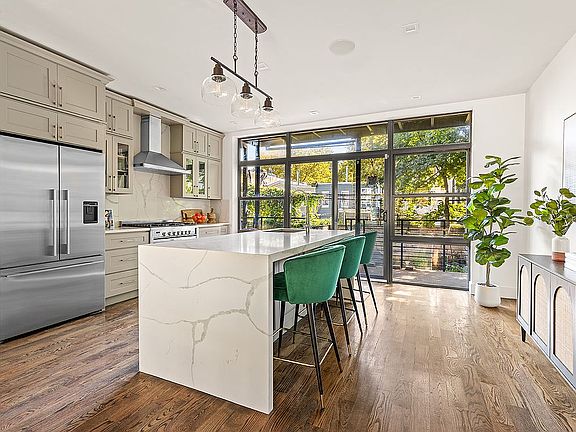 As you enter the parlor level, you’re immediately struck by the expansive open layout—a space that flows the full depth of the home and is drenched in natural light thanks to floor-to-ceiling windows. High ceilings and clean architectural lines add a sense of volume, while hardwood floors anchor the space in comfort. At the heart of the home is a chef’s kitchen, outfitted with a large island, stainless steel appliances, walk-in pantry, and timeless shaker cabinetry. The kitchen seamlessly integrates with the dining and living areas, creating the ideal setting for both quiet nights and lively gatherings. From here, step out to your full-width rear deck, perfectly suited for al fresco dining or relaxing with a morning coffee. Beyond, a private backyard oasis invites gardening, entertaining, or simply unwinding under the sky.