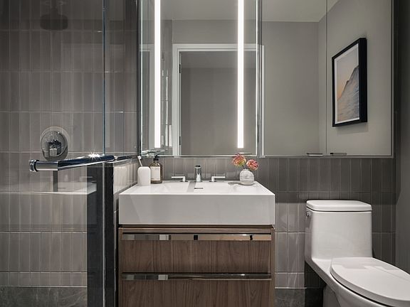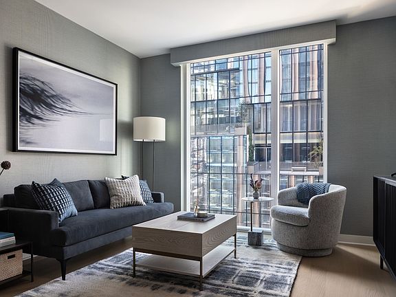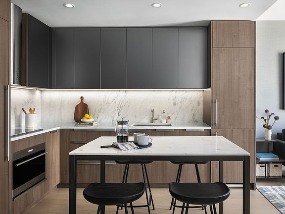 This fully-furnished and fully-serviced 1 Bedroom, 1 Bath is designed in a rich color palette of blues and grays with dark finishes. The L-shape kitchen is equipped with Brazilian marble countertops, full-height backsplash, Wolf induction cooktop and speed oven, and a high-top dining table that doubles as a kitchen island. The cozy bedroom features a queen-sized bed and a customized closet. Complete with floor-to-ceiling windows, Miele W/D, and voice-controlled smart home technology, as well as distinctive services such as weekly housekeeping and room service from the on-site restaurant.