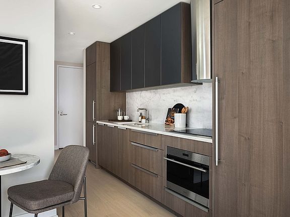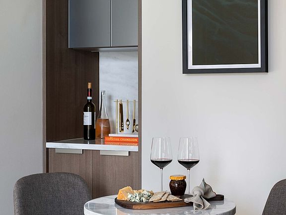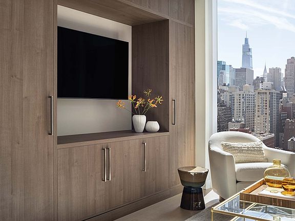 Thoughtfully designed to relax and entertain, this fully-furnished and fully-serviced Corner 1 Bedroom, 1 Bath features a custom Italian media wall, built-in bar, and king-sized bedroom. The kitchen is equipped with Brazilian marble countertops, full-height backsplash, and Wolf induction cooktop and speed oven. Complete with floor-to-ceiling windows, Miele W/D, and voice-controlled smart home technology, as well as distinctive services such as weekly housekeeping and room service from the on-site restaurant.