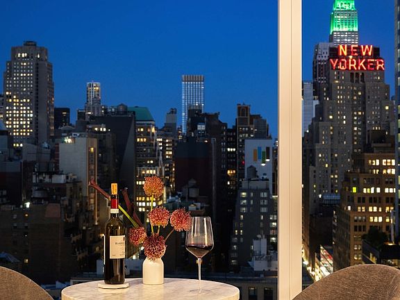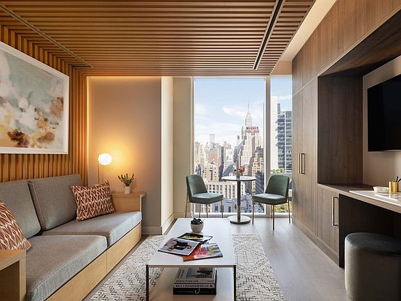 This fully-furnished and fully-serviced Studio, 1 Bath features the Ori Cloud Bed, which disappears into the ceiling to reveal a cozy living space, and is complete with built-in millwork that provides added storage, desk and media wall, plus a walk-in closet, voice-controlled smart home technology and Miele W/D. The kitchen is equipped with Brazilian marble countertops, full-height backsplash, and Wolf induction cooktop and speed oven. Floor-to-ceiling windows frame views of the Empire State Building, while services such as weekly housekeeping and room service from the on-site restaurant make this a truly unique living experience.