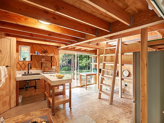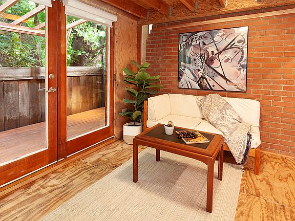 Designed and built by award winning French architect Francois Perrin, "Air House" is a unique structure set in a garden as a guesthouse in the coveted leafy Santa Monica-Brentwood area. Featured in architectural publications, the apartment is flexible, a cozy two level customized space via semi wrap-around decks. Dining indoors or on a deck. Sun on the lawn, and grow your own herbs and vegetables in garden plots. The upstairs deck offers views of rosy sunsets over the trees. Sleep or work upstairs or down. A fully-equipped kitchenette, including a new, spacious stainless steel refrigerator. Separate hot water tank. Unique polygal air space insulation keeps the apartment at a comfortable temperature. The Brentwood Country Mart is one block north, with stores, restaurants, banks, and a post office. Bus stops to nearby UCLA, Santa Monica College, and LAX. Enjoy a sand and sun beach just two miles away. Parking is available. This is an attached, private guest home. Owner pays utilities. Tenant pays for Wifi. There is off street parking for one car.